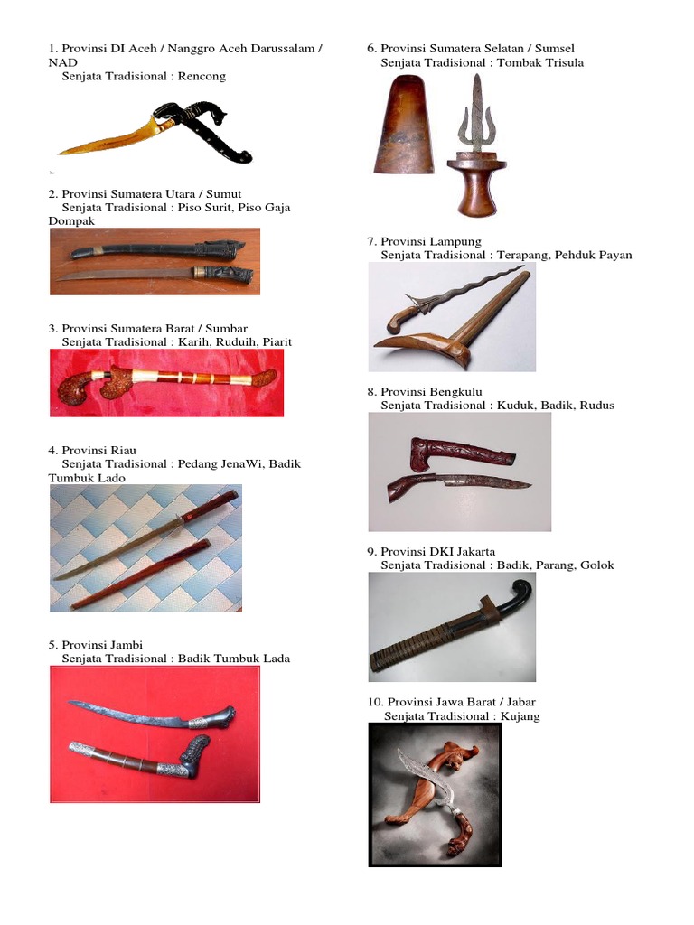 Provinsi bengkulu senjata tradisional : Kemudian, terapang menjadi ikon senjata tradisional lampung. Bendo atau golok merupakan senjata tradisional dki jakarta atau betawi yang paling terkenal yang biasanya dijadikan pelengkap pakaian adat pria betawi untuk kehidupan sehari hari. Senjata adat jawa barat kujang. Senjata tradisional dki jakarta golok biasanya digunakan oleh jawara sebagai senjata untuk membela diri. Senjata tradisional menjadi salah satu bukti kekayaan budaya di indonesia. Golok mempunyai ukuran dan wilahan yang beragam pula. Terinspirasi dari sosok legendaris perempuan terkenal dari tanah marunda (jakarta utara) yaitu mirah. Senjata tradisional ini merupakan peninggalan nenek moyang masyarakat di daerahnya yang memiliki sejarah dan telah melekat secara turun turun temurun digunakan senjata tradisional indonesia 34 provinsi lengkap gambar dan penjelasannya. Senjata adat jawa barat kujang. Sesuai dengan namanya, tari topeng betawi menggunakan. Karena kebanyakan dari mereka terlalu sibuk dengan urusan seperti pacaran, ke salon, shoping. I'm hung duy, the founder of xml blogger templates (xbt).